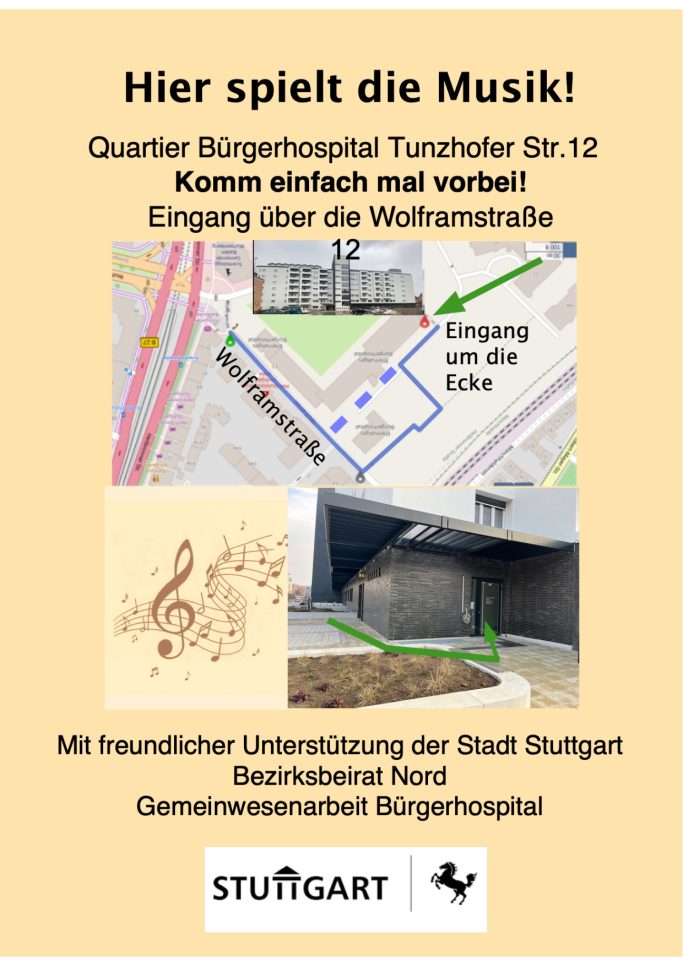Unsere Arbeit begann in der Gemeinschaftsunterkunft in der Tunzhofer Straße (Areal des ehemaligen Bürgerhospitals). Tunzhofen war eine frühere Siedlung von Stuttgart. Heute erinnert nur noch der Straßenname daran. Hier fanden wir im Jahr 2017 die Kinder aus aller Welt, mit denen wir Musik machen.